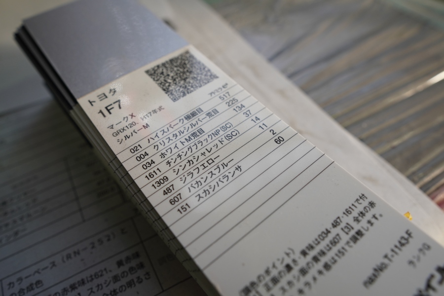 色合わせの出発点は、メーカーのカラーデータです。登録されている色コードをベースに塗料を調合し、そこから実際の車体と見比べながら微調整を加えていきます。